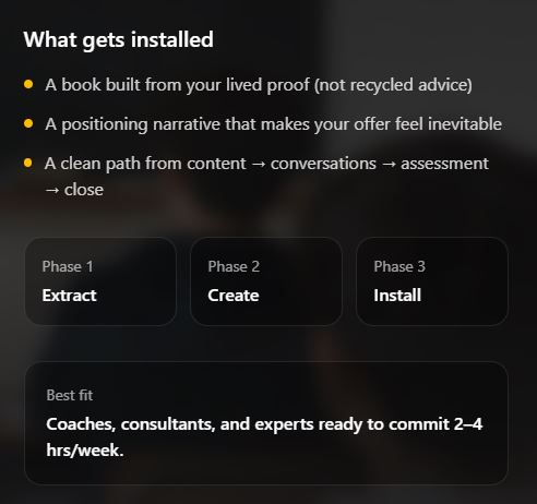 Authority Installed™ is a done-with-you system that extracts your real IP, turns it into a market-ready book, and installs it into your positioning so the right clients show up pre-sold.